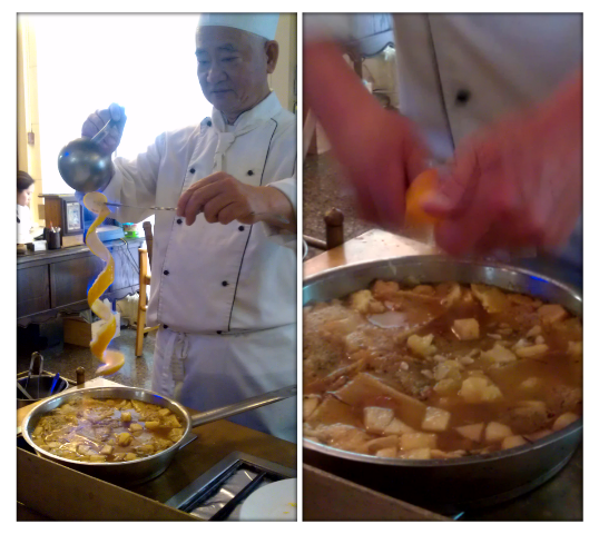 法式火焰薄餅其實已經沒在表演給客人看了 , 因為我媽的詢問 , 主廚特別把推車推到我們桌邊 , 為我們服務一下 !薄餅的煮法也有改變 , 我比較喜歡以前那種方法 , 直接把麵糊淋上去煎 , 又翻面 , 再擺盤 , 澆上事前用柳橙柑橘炖好的醬汁 , 在如圖中一樣拿著澄皮從上淋下在旁邊燒好的酒 , 製造火焰