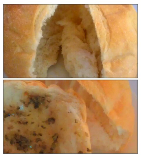 這是它比拳頭大一點的外面酥脆裡面鬆軟的餐前麵包 , 還沒扳開之前 , 可以用手敲敲看 , 會有紮實的聲音 ~