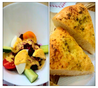 重點是它的沙拉醬 !!!別於大眾口味的凱薩 . 和風醬 , 是用蜂蜜芥末醬 , 應該有混合一些美乃滋 , 因為吃起來的味道沒有很重 ! 沙拉吃光光 , 麵包是現做現烤 , 上面塗上厚厚的香蒜 , 吃起來表皮酥脆 , 裡面的口感是鬆軟但是不像一般麵包店那種不扎實的感覺麵包配上沙拉有不一樣的味覺感受 , 可以試試看 , 我覺得滿好吃的 !