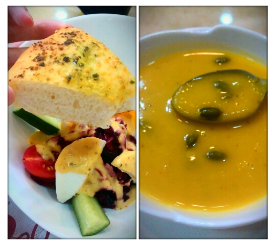 黃澄澄的南瓜濃湯 , 絕對是用真南瓜來熬煮而成的 , 它的纖維顯而易見 , 滿有巧思的 , 還灑上南瓜籽做搭配 , 而不是用普遍的香料撒一戳就端出來 !