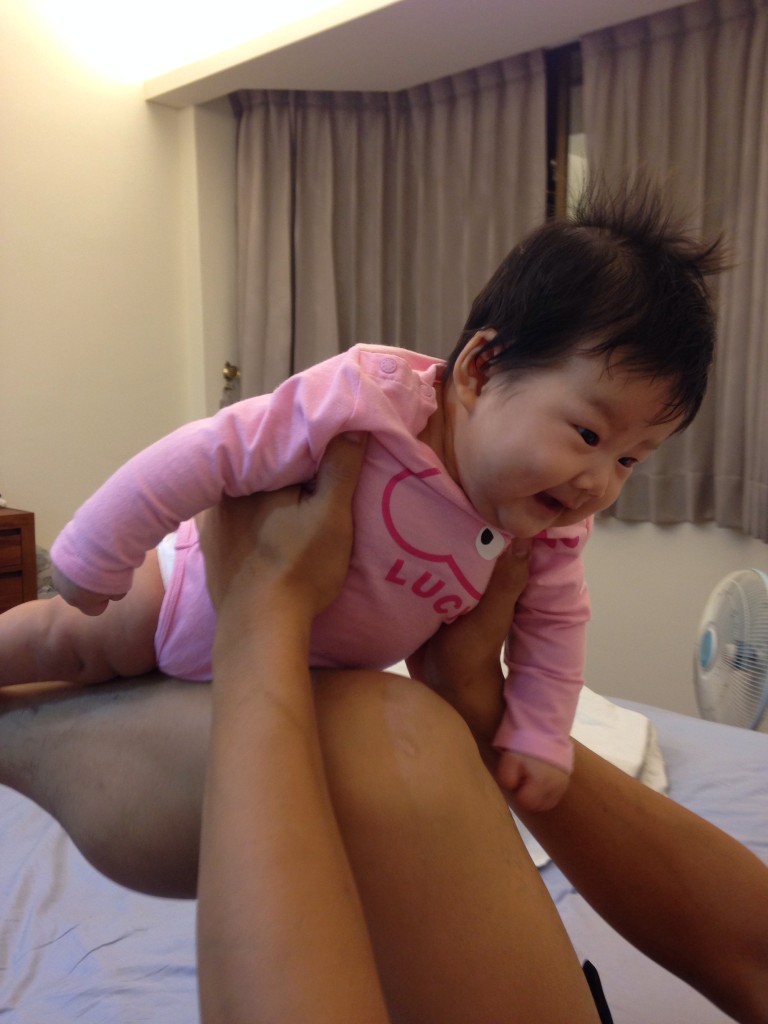 在愛妞三個月後,會抬頭,脖子硬的時候常常跟她玩親子平衡遊戲!!